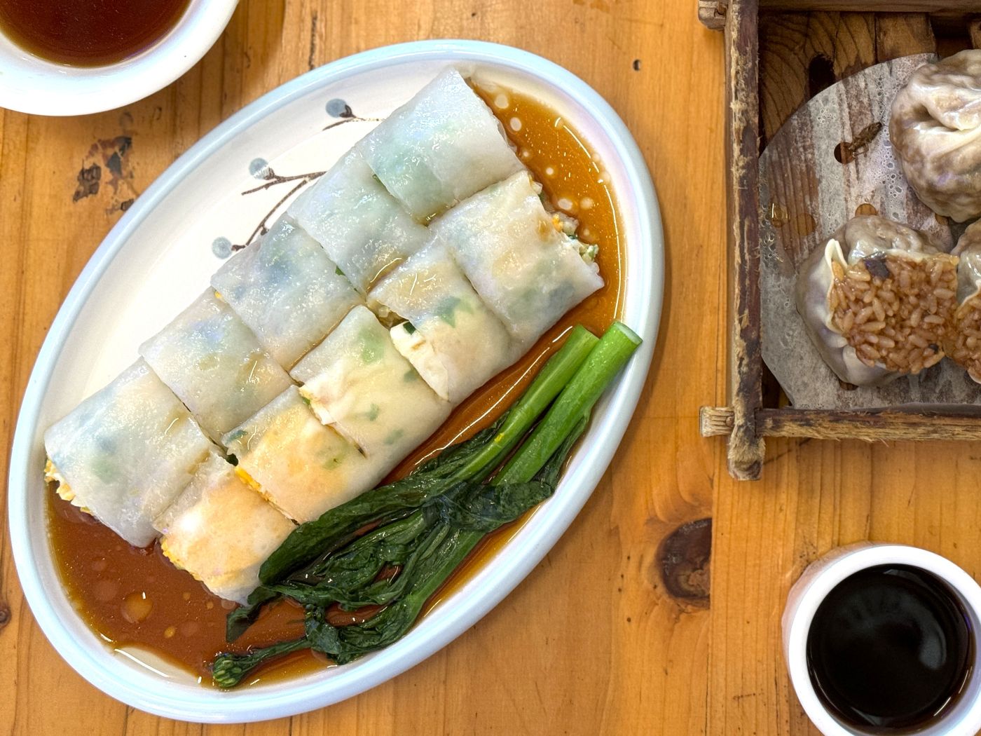 多くの日本人がイメージしている腸粉は、香港で食べるこちらの腸粉。つまり、うっすら半透明の生地で具を巻き、ピーナッツ油の効いたあまじょっぱいタレをかけて食べる腸粉です。
