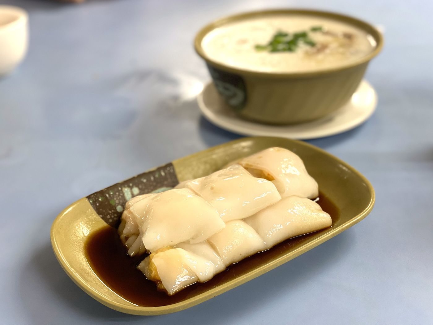 香港や広東省の珠海からアクセスのよい澳門(マカオ)。ここは日本でもよく見る、くるりと巻いた腸粉が楽しめる地域です。写真は朝食にオーダーした、海老腸粉と粥の組み合わせ。見るからにとぅるっとぅるの皮がそそります。