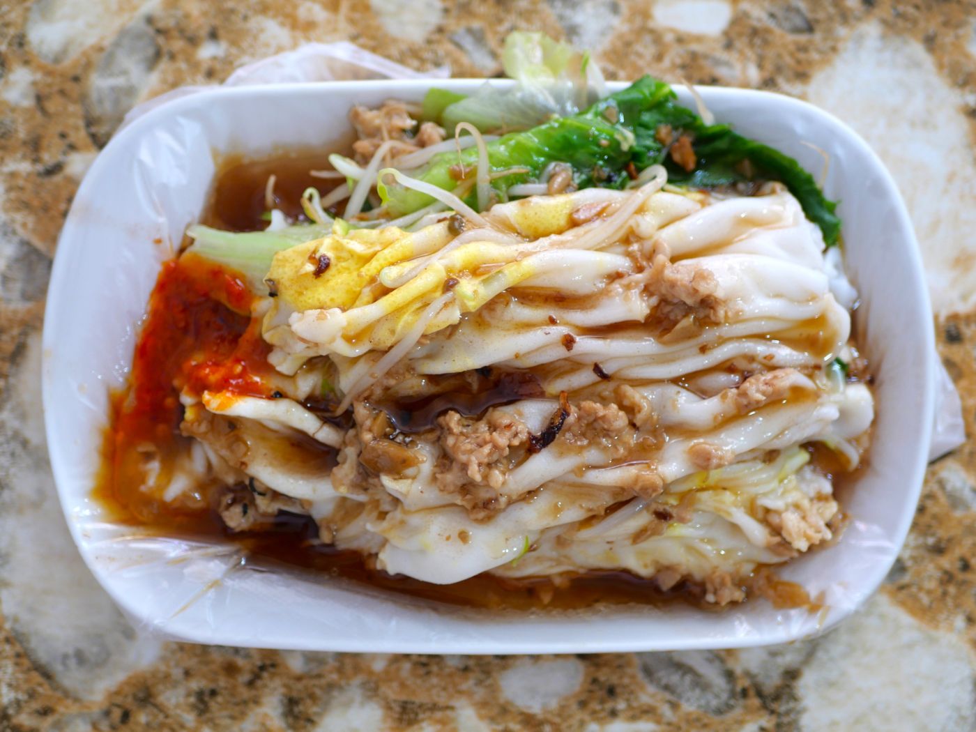 この地域の腸粉は基本的にオムライススタイル。モヤシやニラなどたっぷりの具を、軟らかな米粉の生地で覆うようにして仕上げており、くるりと巻いた腸粉とはまったく異なるビジュアルです。