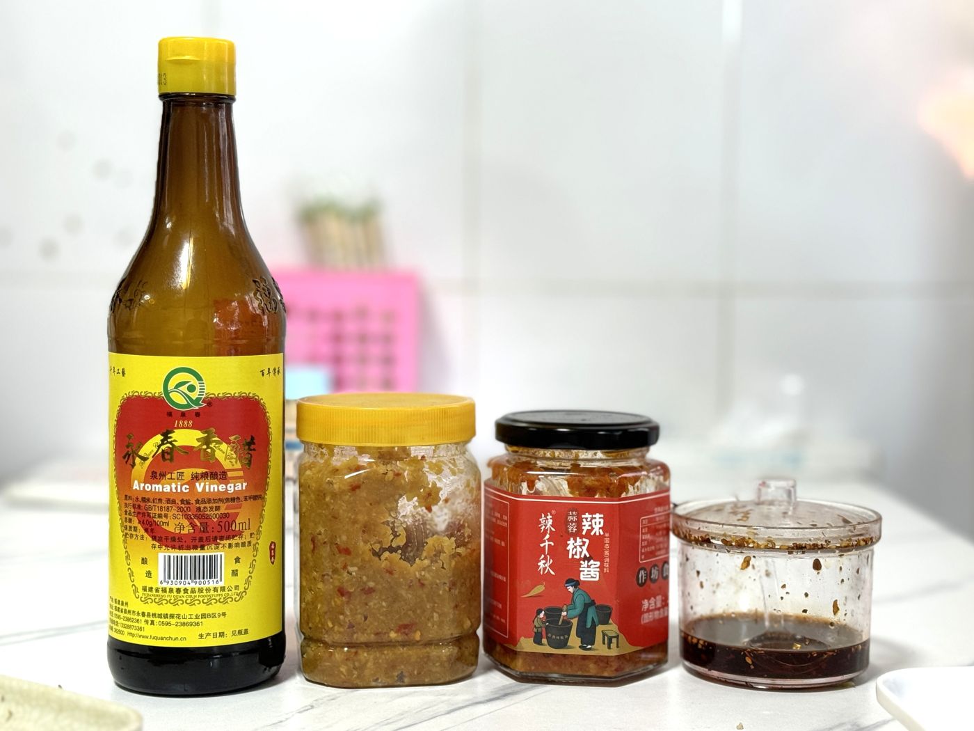 生地はやや硬めで、具は巻くのではなく包装紙で包むようにまとめます。たれは福建が誇る永春香醋(黒酢)、大蒜ベースの調味料、辣椒醤(唐辛子ペースト)、醤油を好きなようにかけて食べるスタイル。ガツンとパンチのある味付けで、おかずにもなる味です。