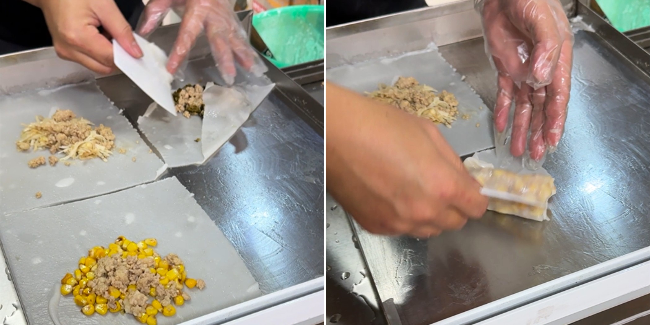 福建省漳州|四角い生地にとりどりの具。畳んで作るおかず系腸粉