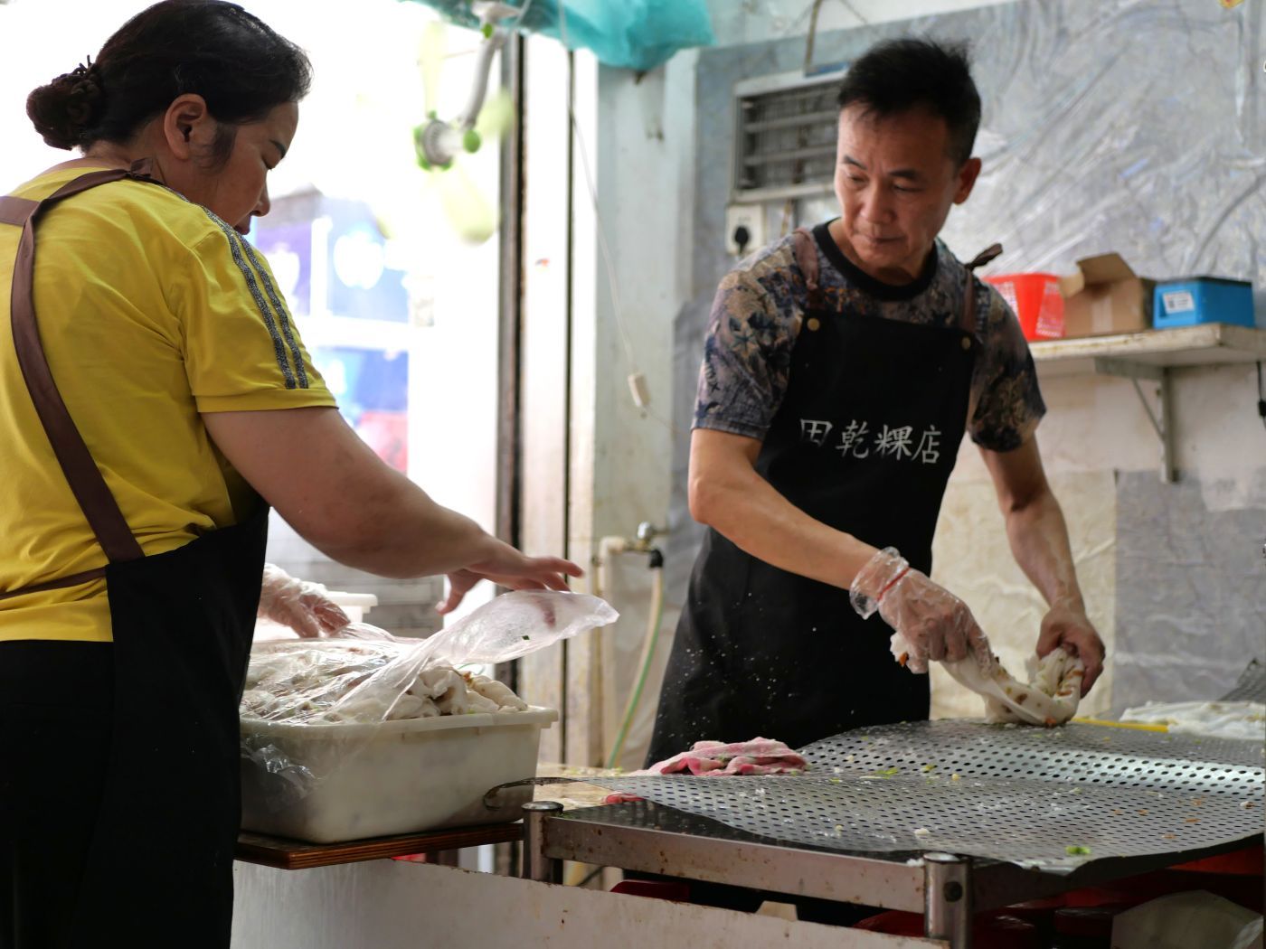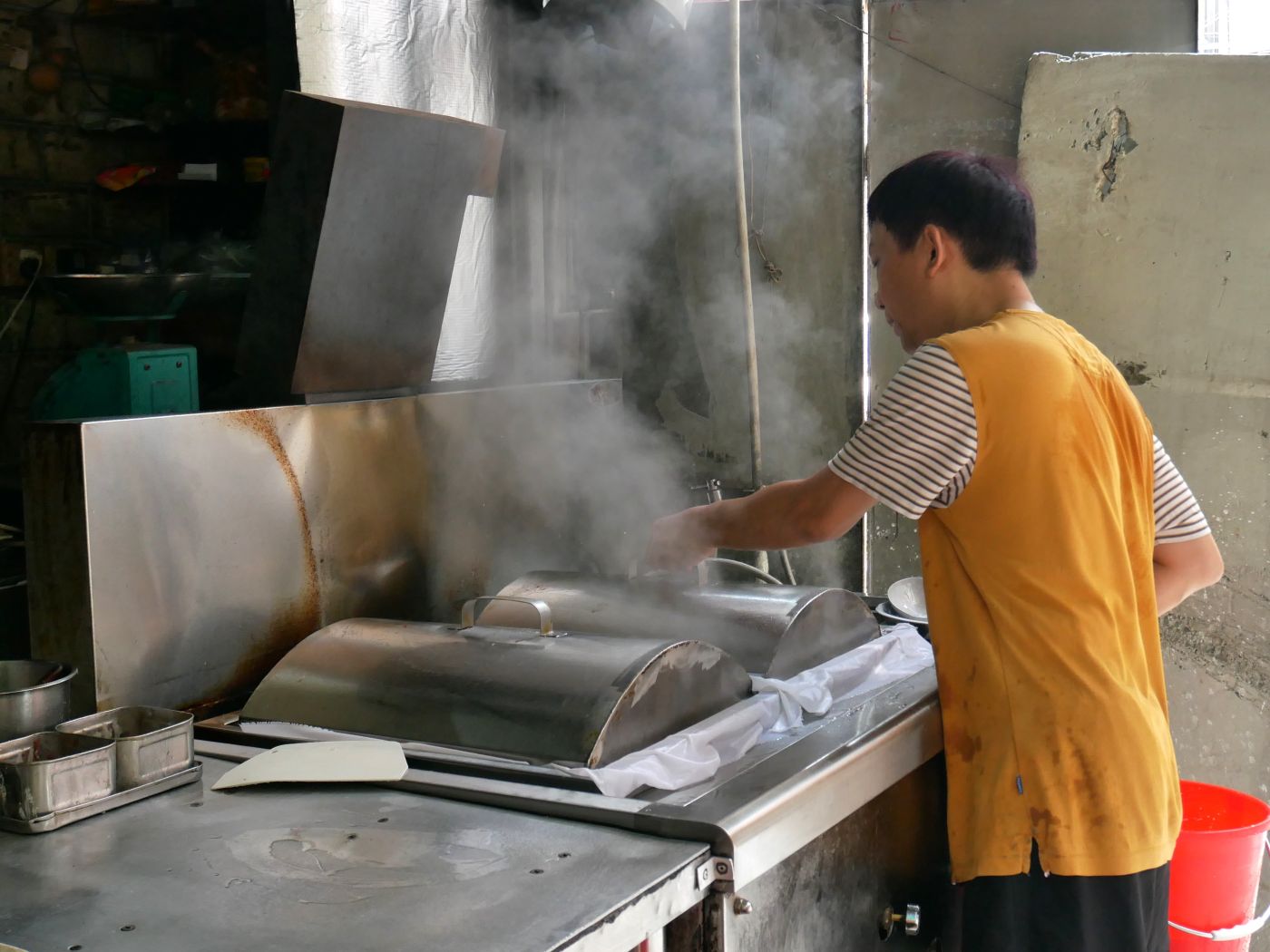 また、蒸すときは、バットが引き出し状になった腸粉専用蒸し器を使うこともあれば、1枚1枚生地を流して作ることも。使う道具によって、生地は四角や丸形に形を変えます。