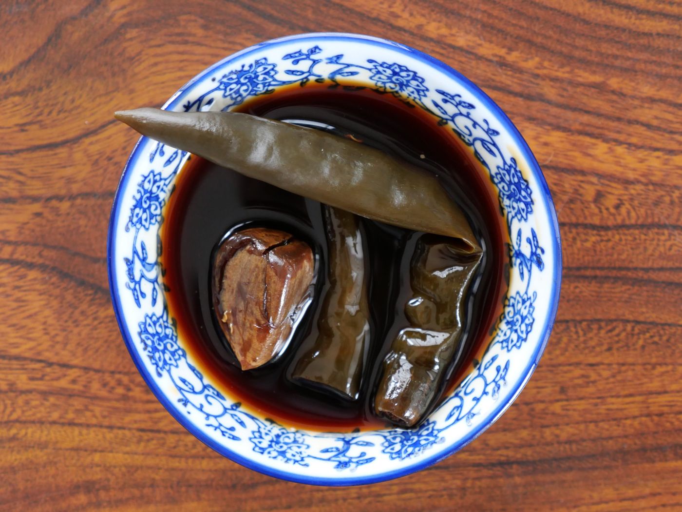 醤油に青唐辛子とにんにくを漬けたもの。どんな料理に使っても飯泥棒と化すことは間違いない。
