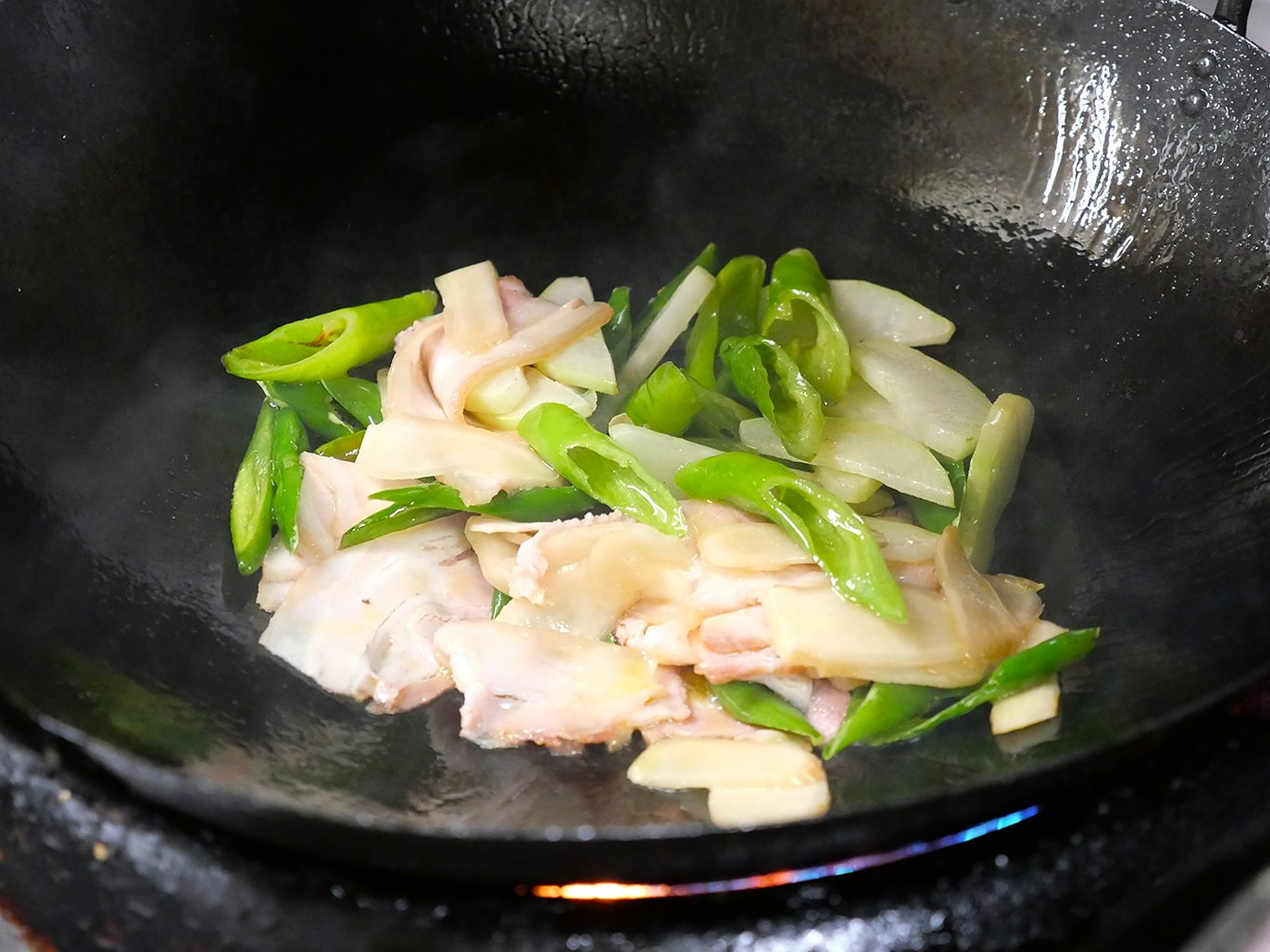 2:新生姜の泡菜(泡姜|パオジャン)の薄切りを油で炒め、スープを少し加えて、茹でた皮付き豚バラ肉の薄切り、1の冬瓜と青唐辛子を合わせる。