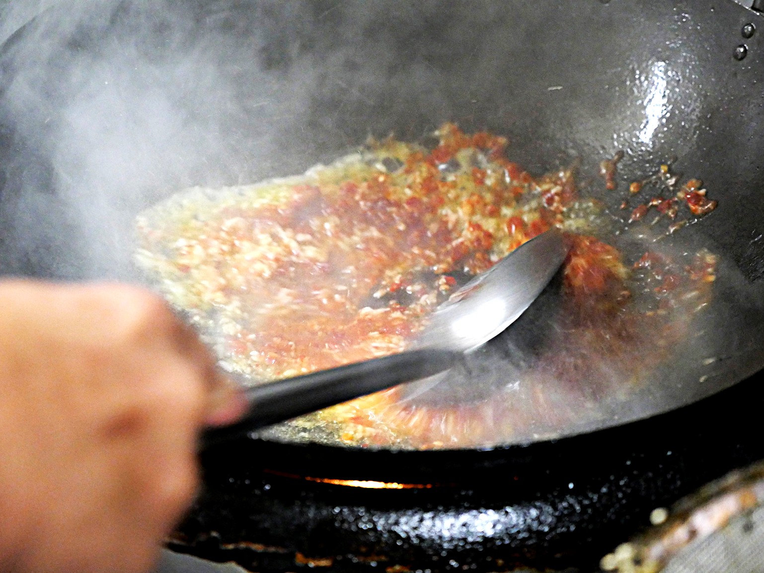 2:自家製の酒醸 (ジウニャン:もち米の発酵調味料)、にんにくと生姜のみじん切り、泡辣椒、スープ、炸醤(ザージャン:肉味噌)を油で炒める。
