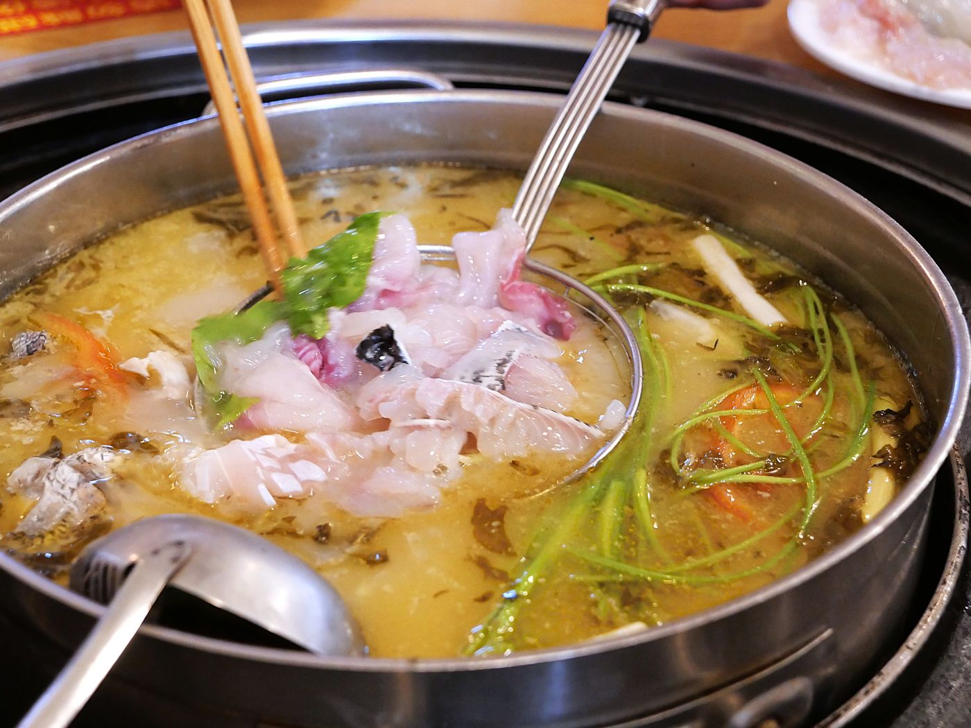 その酸菜魚をさらに進化させ、鍋料理に仕立てたのが酸菜魚鍋(酸菜魚火鍋)。スープを増し、魚をしゃぶしゃぶしながら食べることで、酸菜魚のおいしさをじっくりと楽しめるのが魅力です。