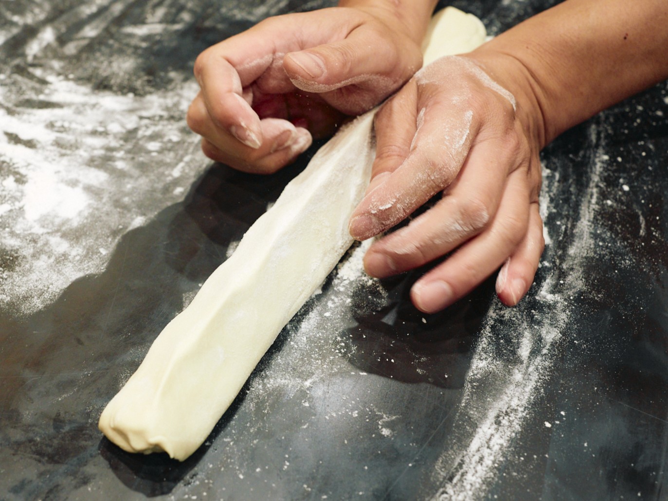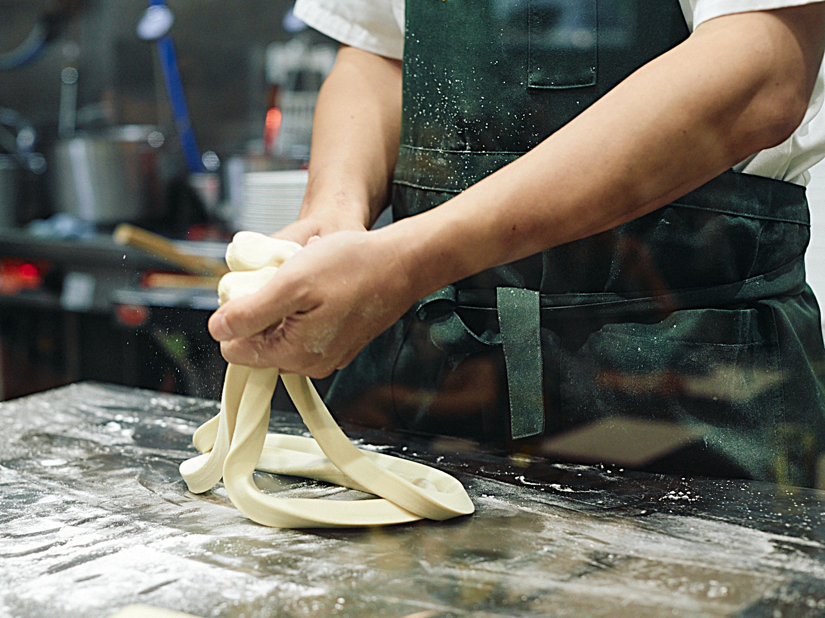 なぜ断面が三角になるのか?というと、麺を延ばす前の生地を三角形に整えてから引っ張るため。ユニークな作り方は、写真で見ていただくと一目瞭然。