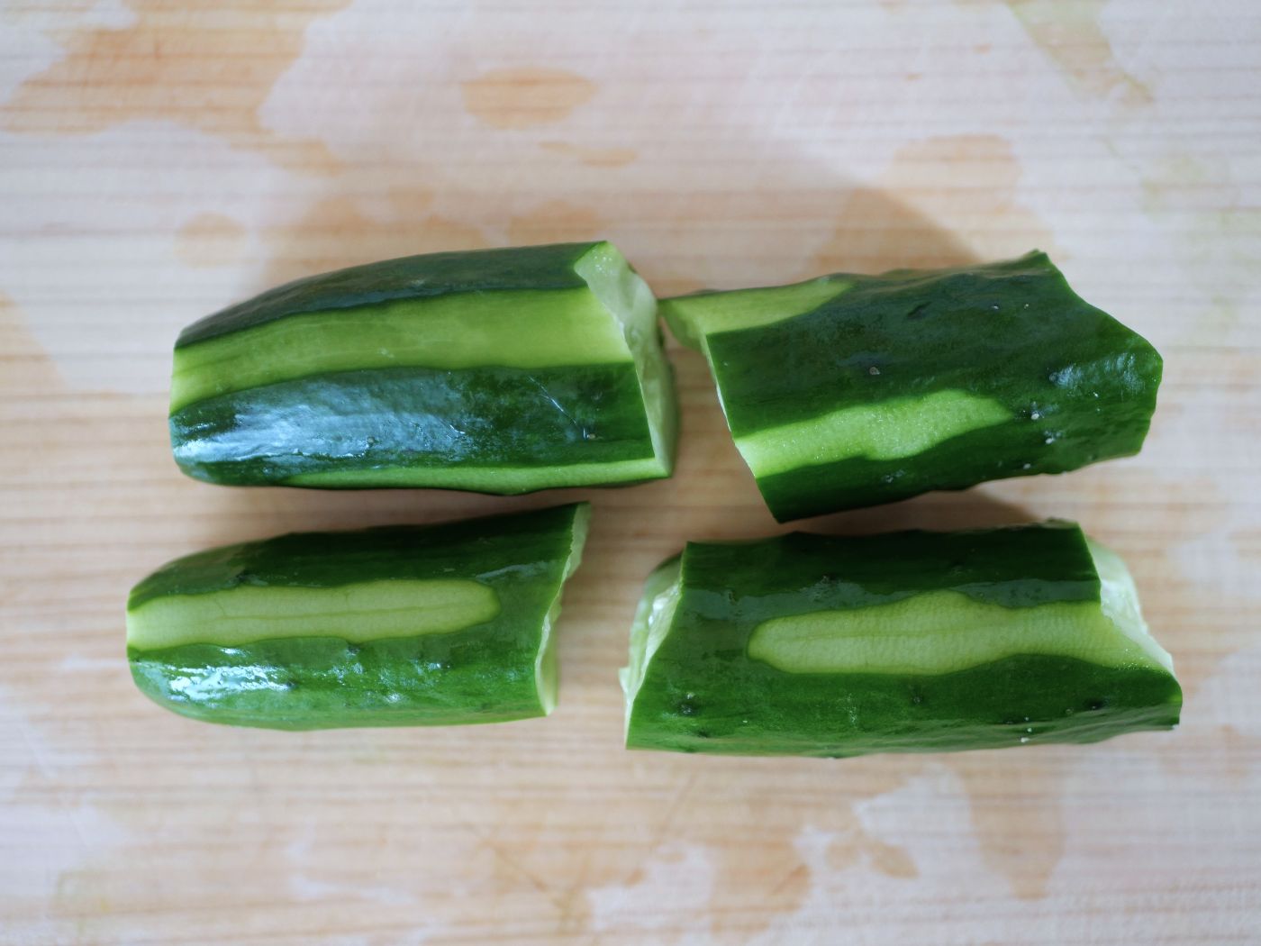 【1】きゅうりの先端部を切り落とし、ところどころピーラーで皮を引く。きゅうりを手で半分に折り、さらに半分に折る。