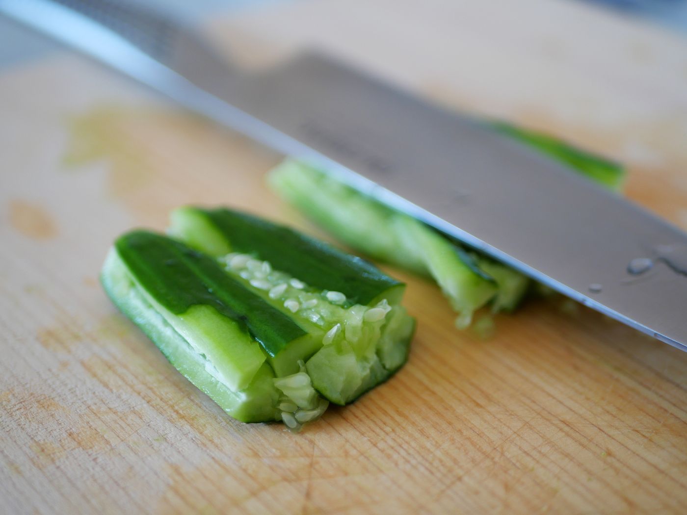 ・きゅうりの皮には、ほんのり苦みや渋み、青臭さがある。ランダムに皮を引くのは、その風味を調整するためだ。食感の観点では、皮の厚い、端に近い部分を多めに引くのがおすすめ。皮の風味が好きな方は、皮を引かなくてもよい。また、引いた皮は水に入れておくときゅうりウォーターができる。食事のお供にどうぞ。