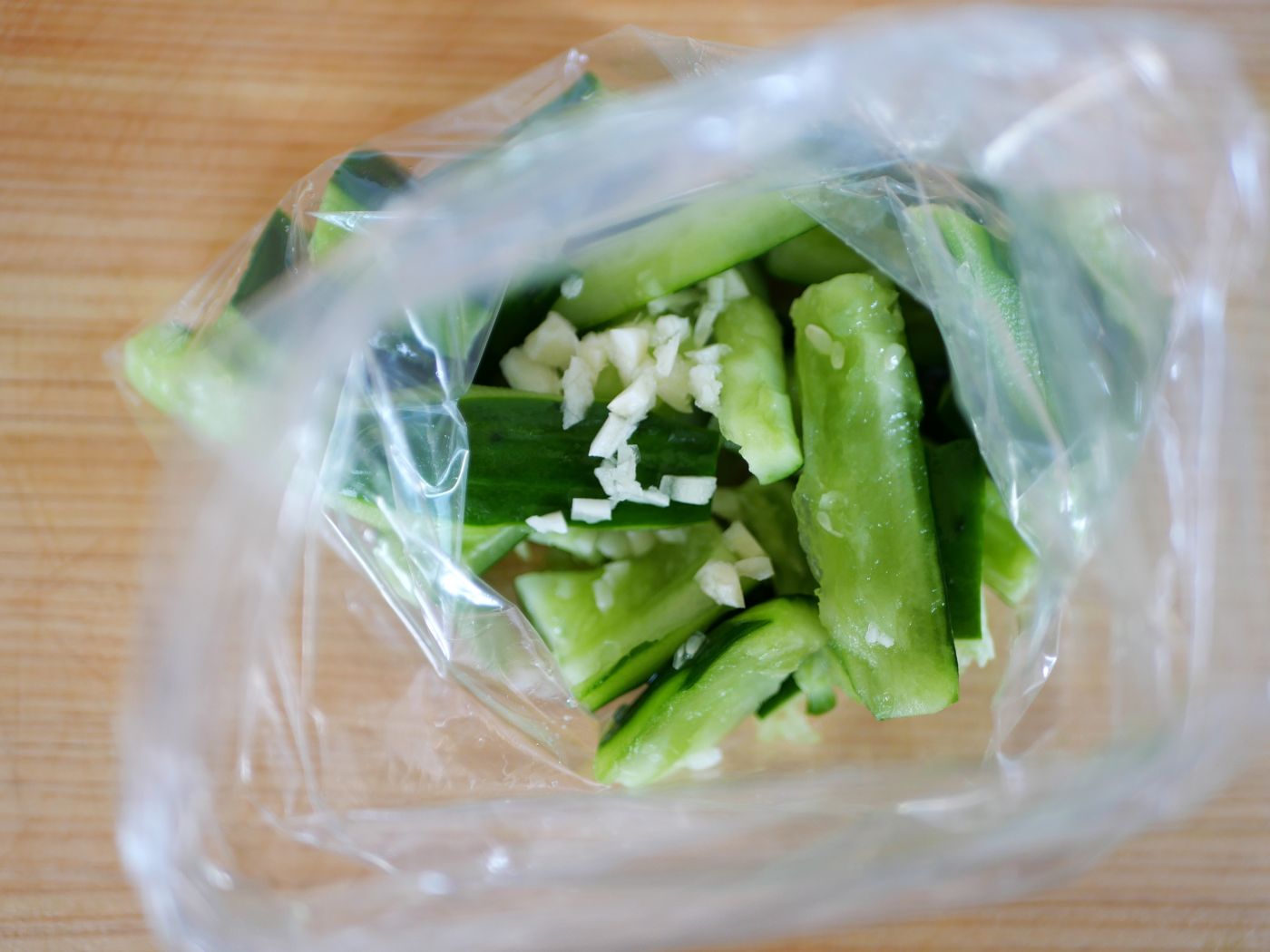 【3】きゅうりを手で食べやすい大きさに分け、にんにくと一緒にビニール袋に入れる。塩小さじ4分の1を入れて振り混ぜる。