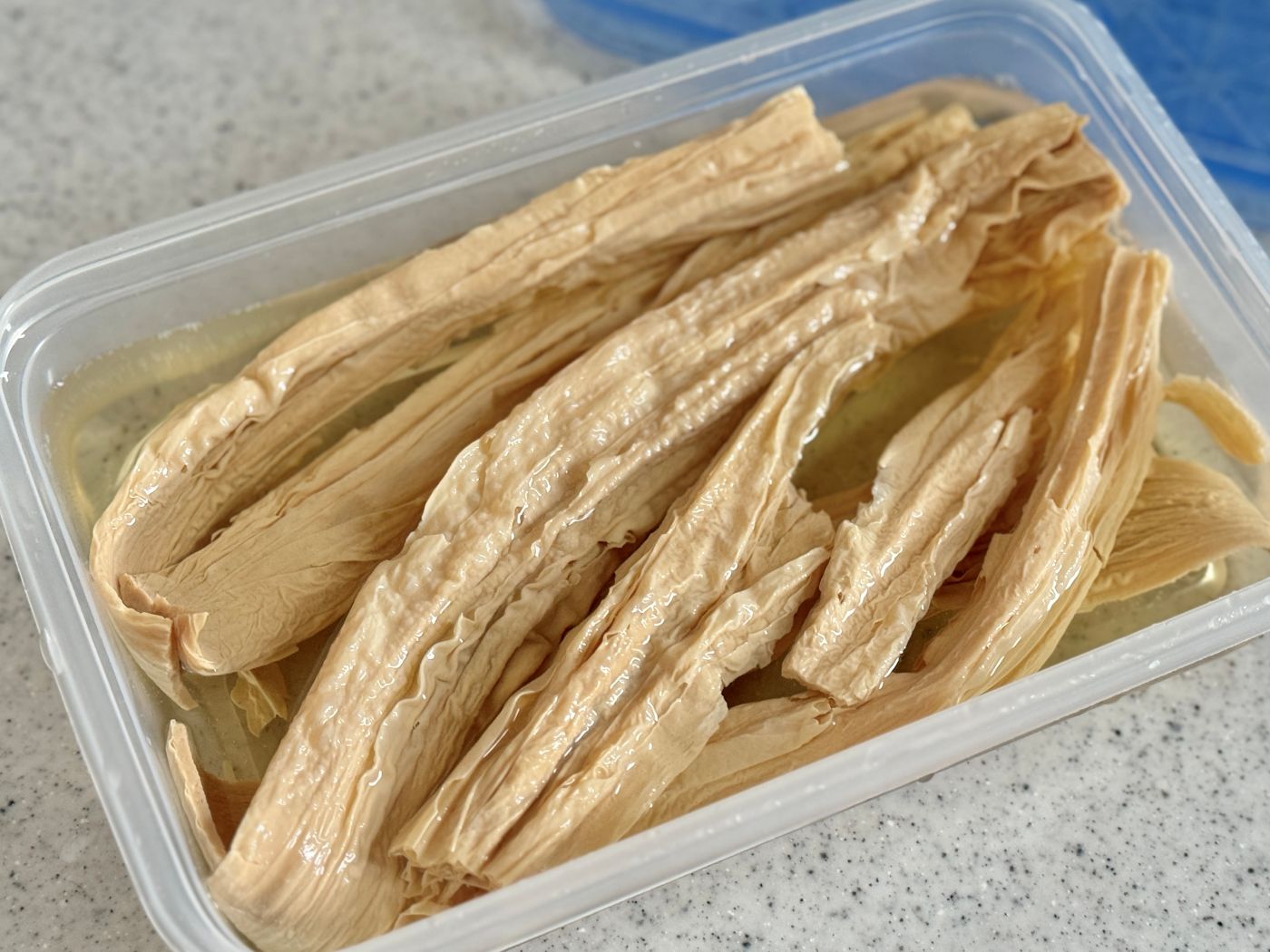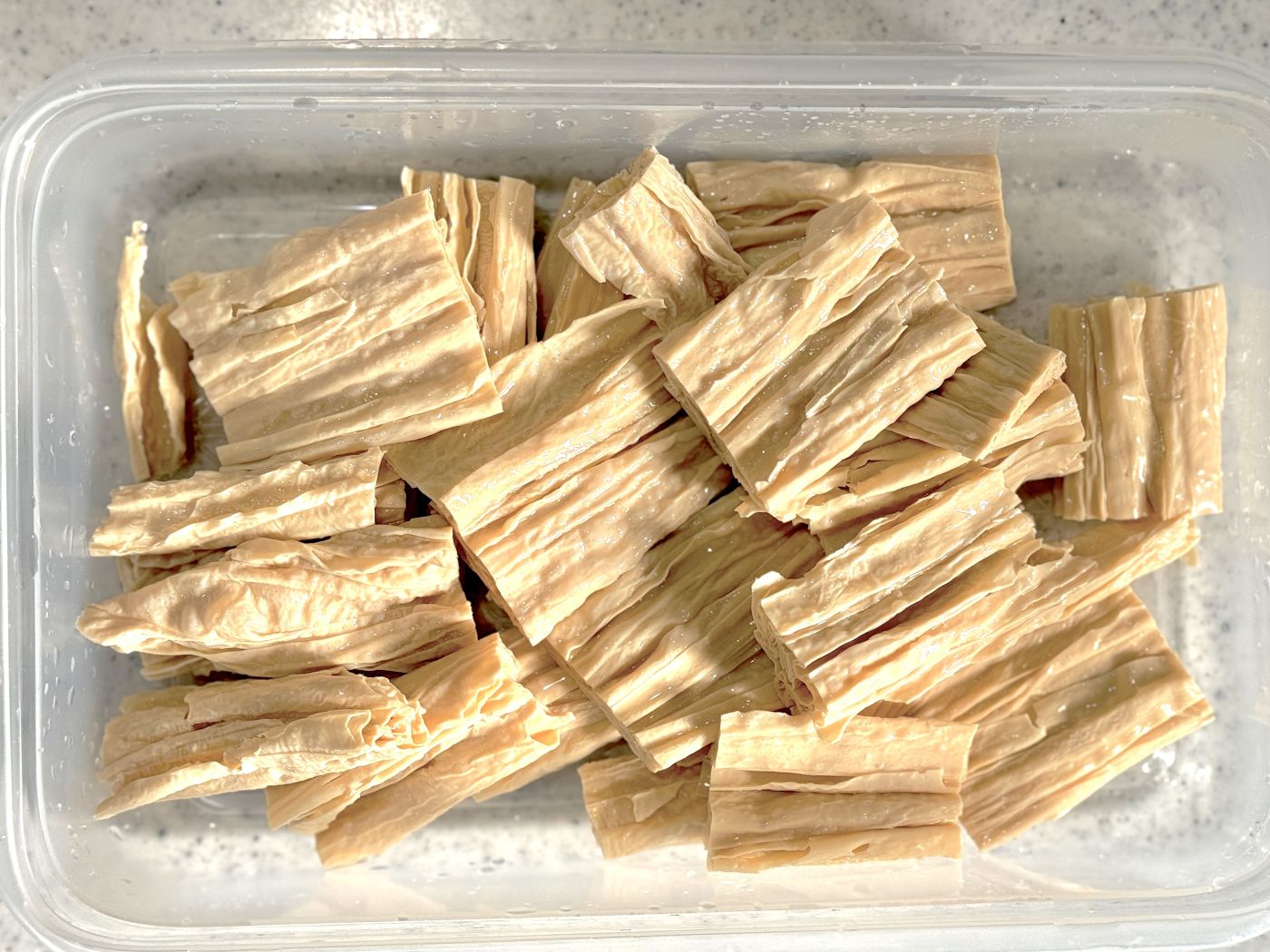 およそ1時間くらいで戻るが、前日から一晩浸しておいてもいい。戻す過程で、水の色が茶色くなったときは水を替える。60gの腐竹を戻すと200gくらいに膨らむ。
