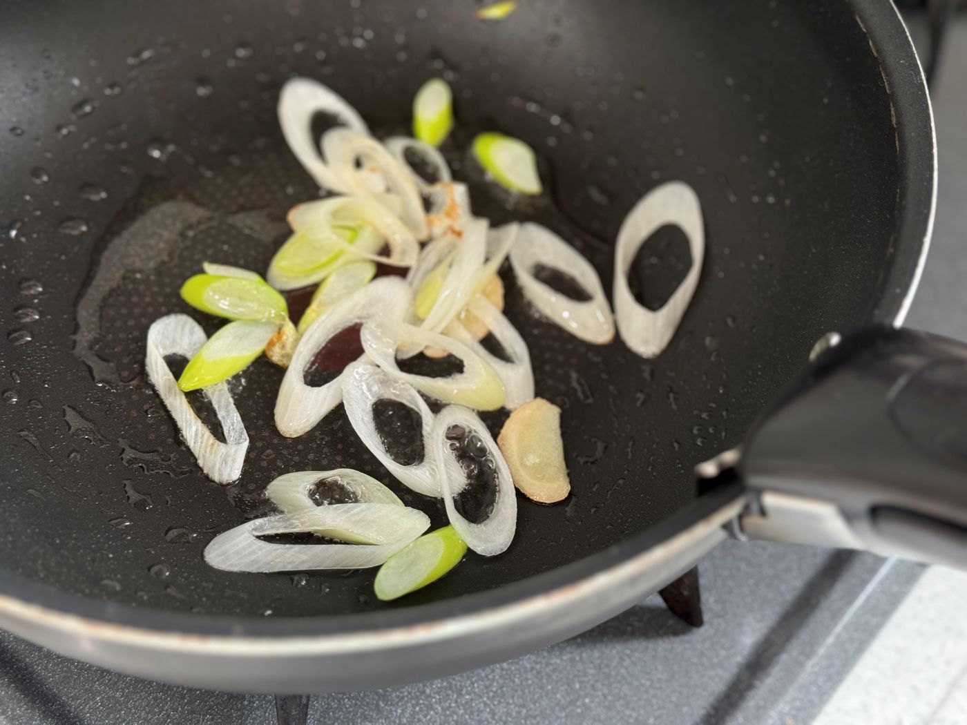 4:葱・生姜→きのこの順に、香りを確認しながら材料を炒める
